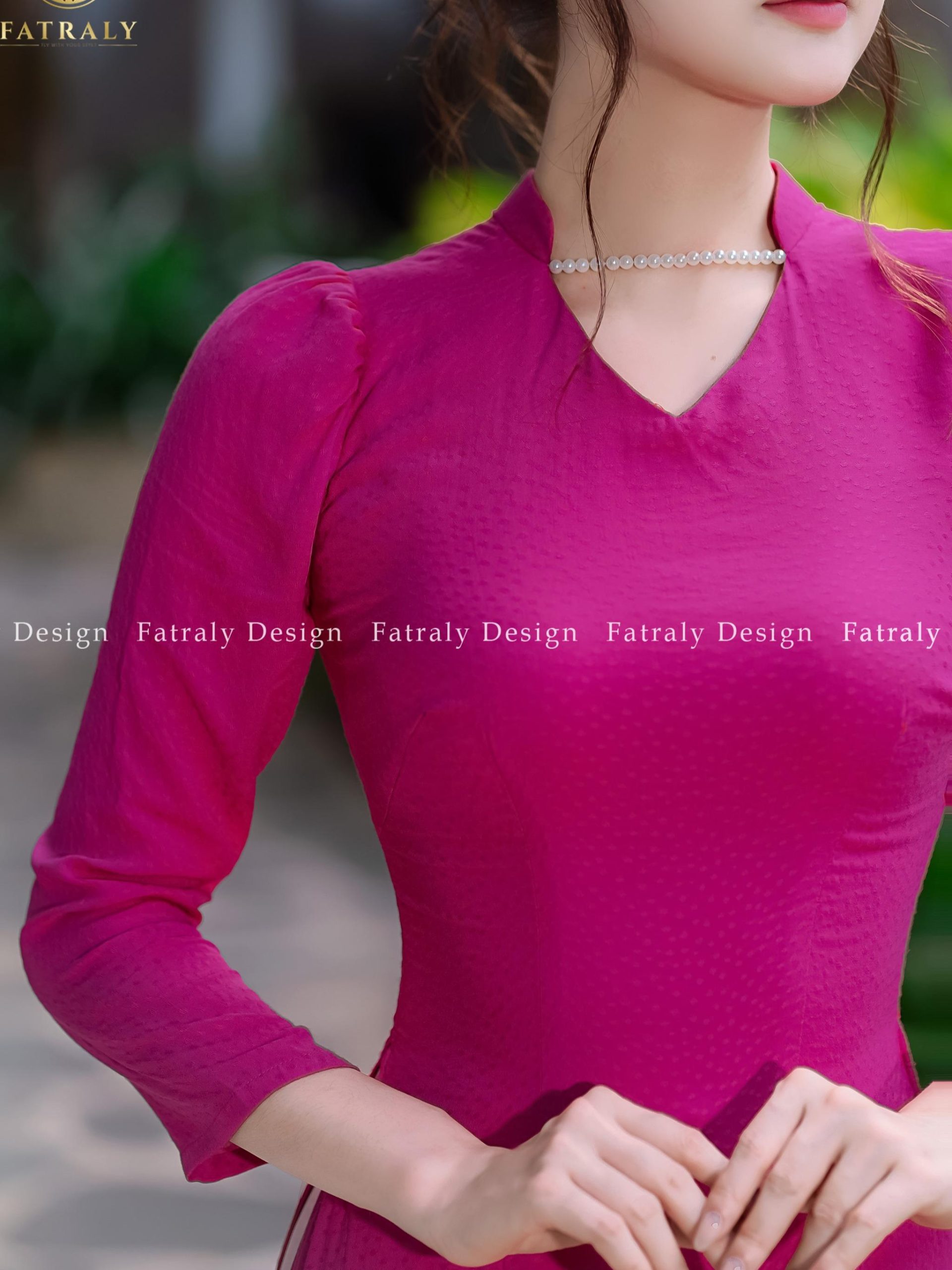 Áo dài cotton vân nổi cao cấp, thiết kế cổ V cách điệu tôn dáng