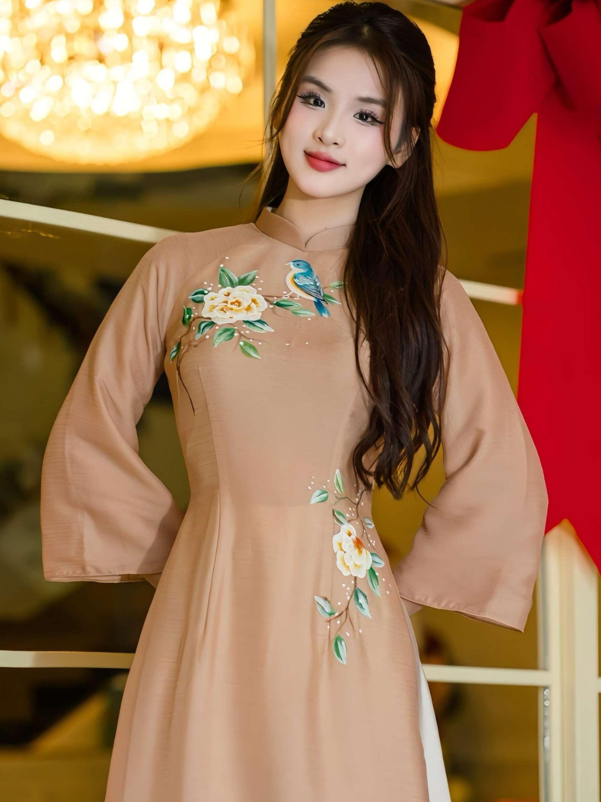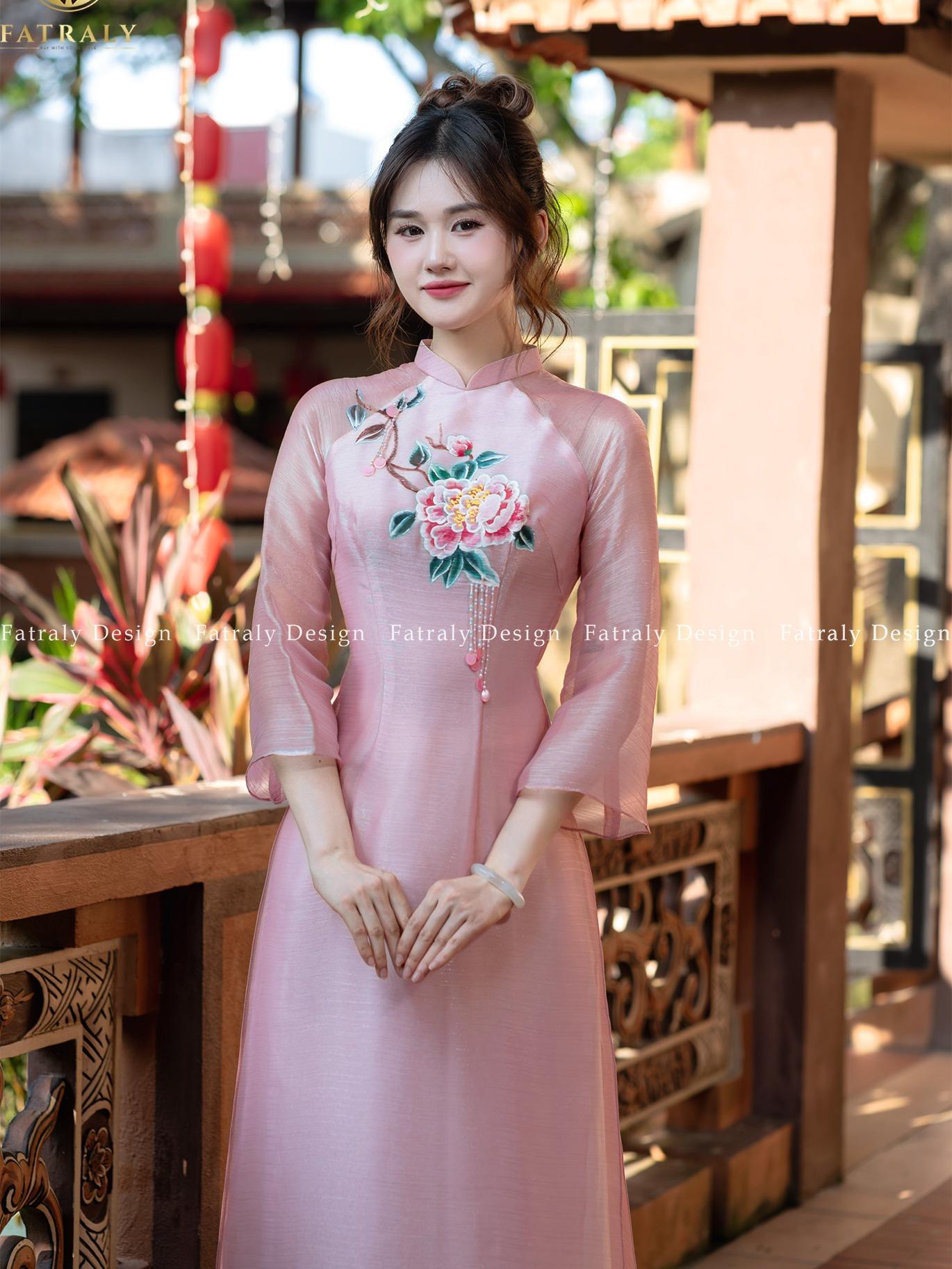 Áo dài tơ tằm châu sa hoạ tiết dệt chuyên biệt, thiết kế tinh tế, chất liệu cao cấp sang trọng