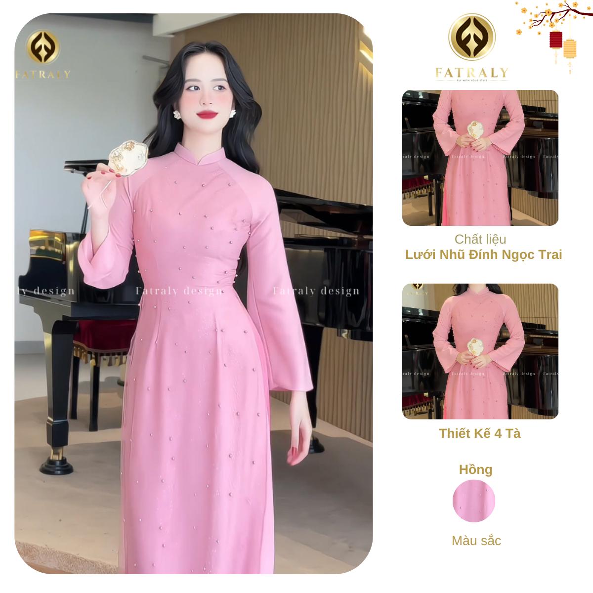 Áo Dài Hồng Ngọt Ngào Từ Lưới Nhũ Đính Ngọc Trai Full Thân, Thiết Kế 4 Tà Cao Cấp