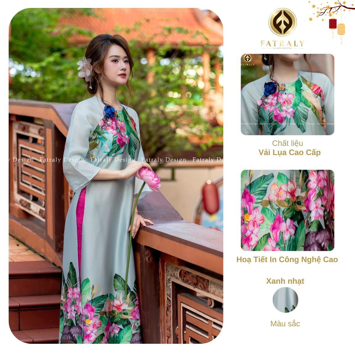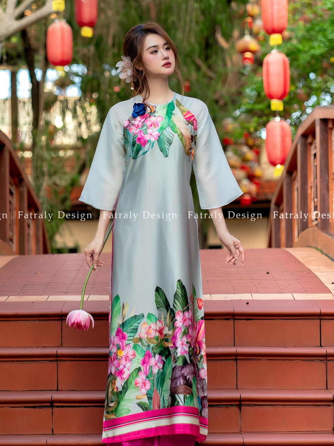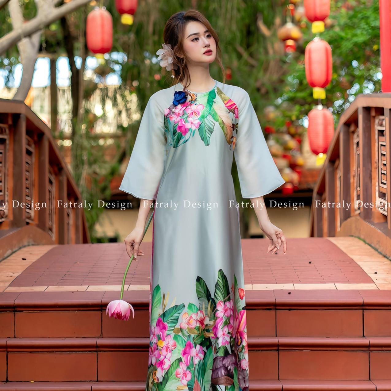 Áo Dài Lụa Xanh Nhạt Thiết Kế Dáng Suông Cao Cấp Với Hoạ Tiết Hoa Xuân In Sắc Nét