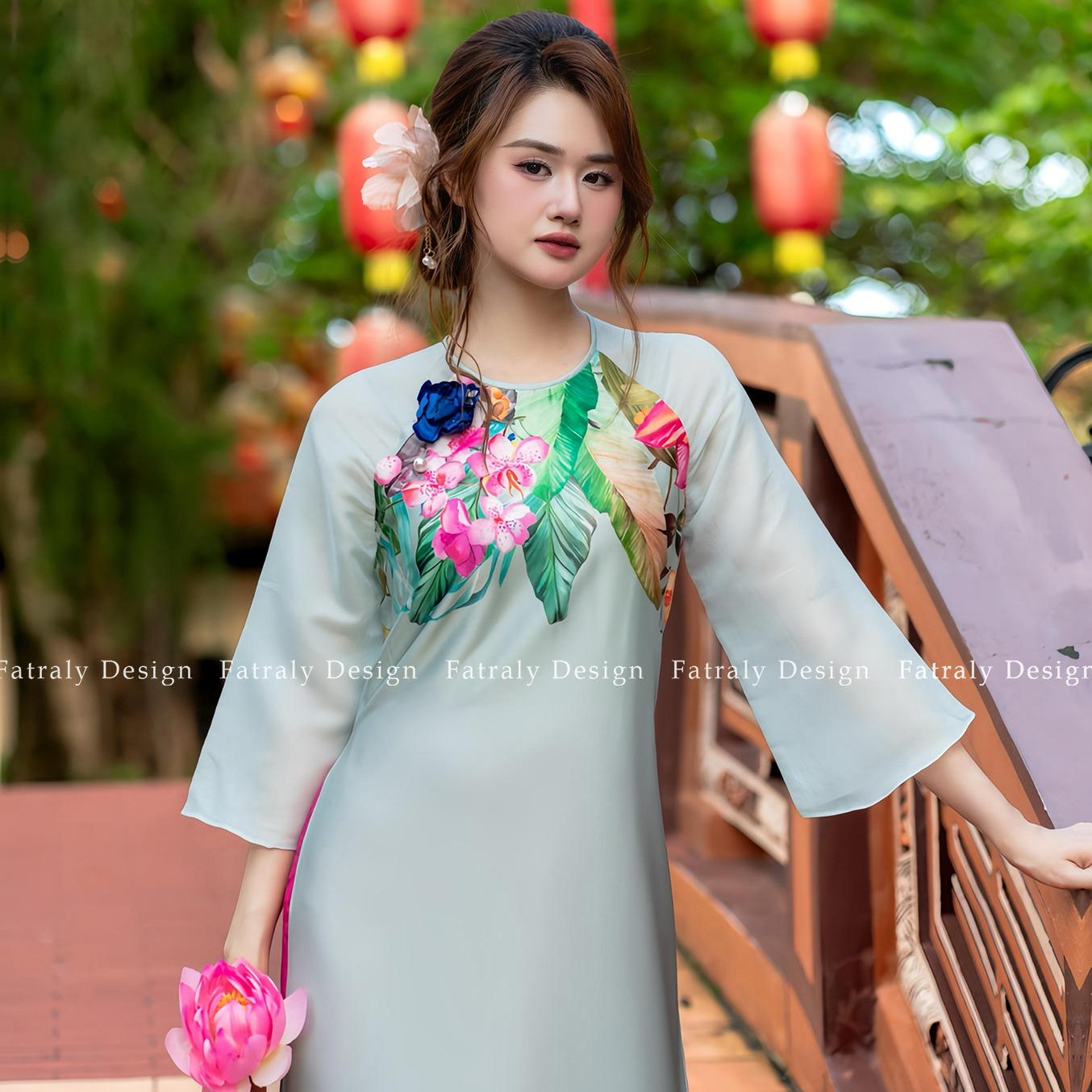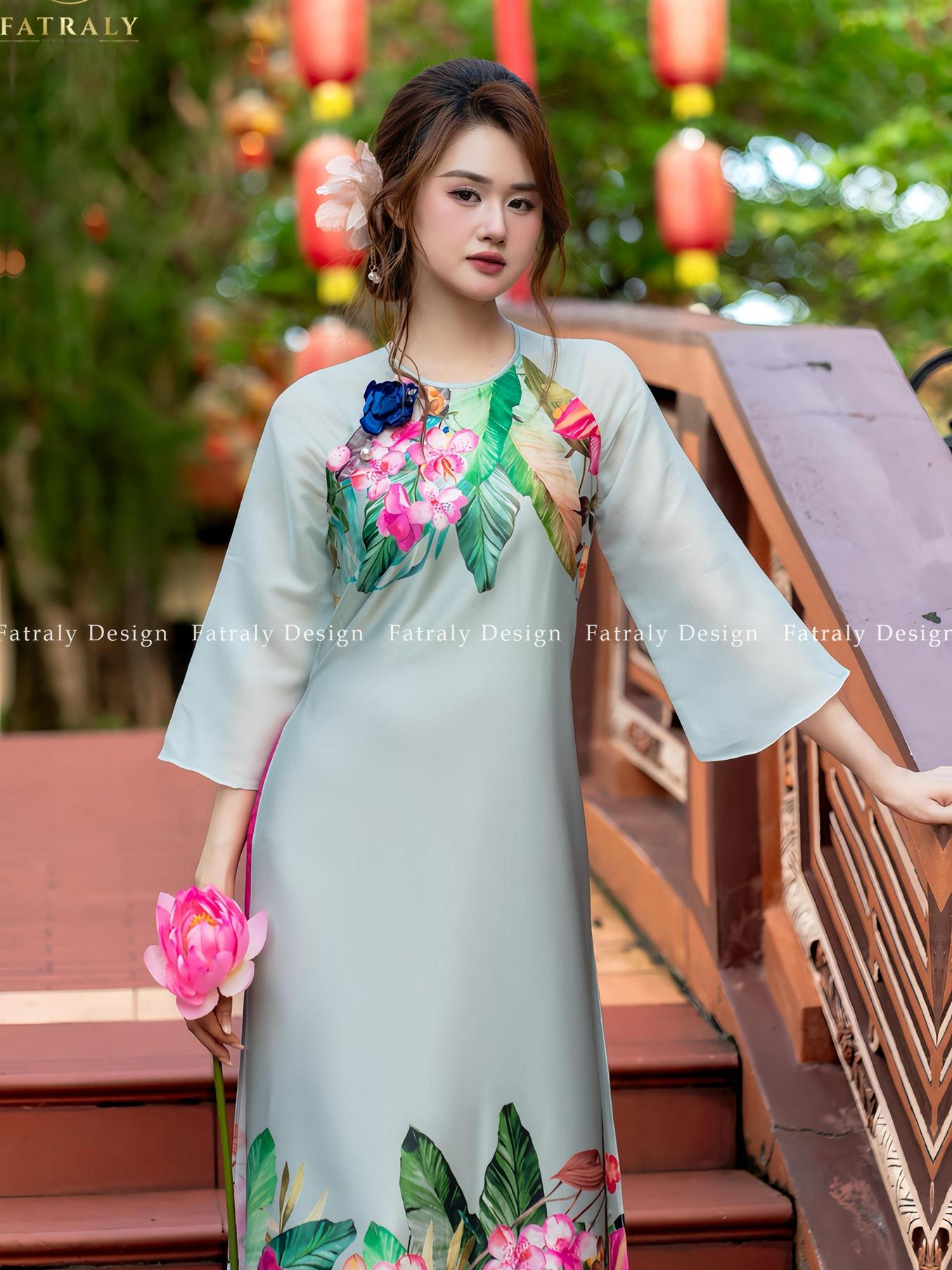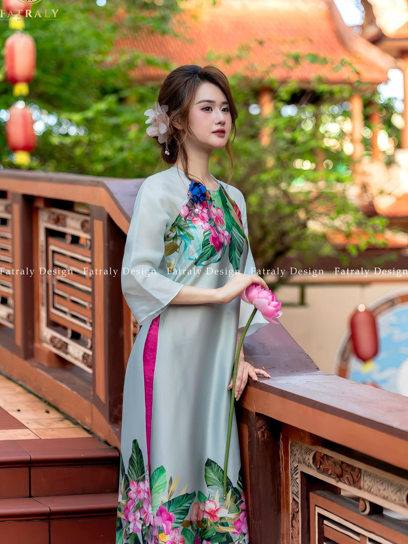 Áo Dài Lụa Xanh Nhạt Thiết Kế Dáng Suông Cao Cấp Với Hoạ Tiết Hoa Xuân In Sắc Nét