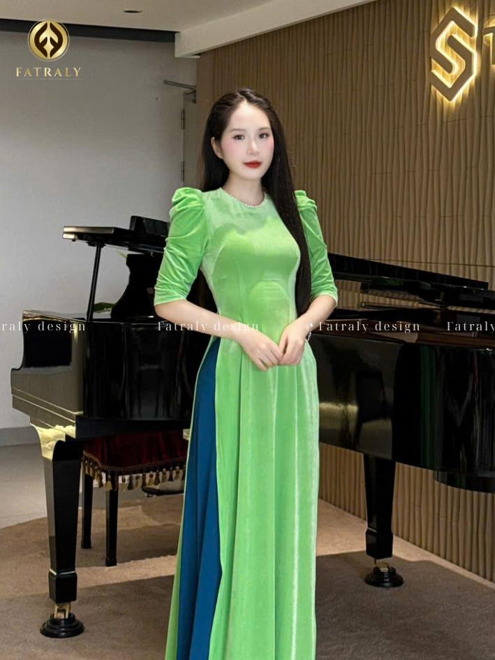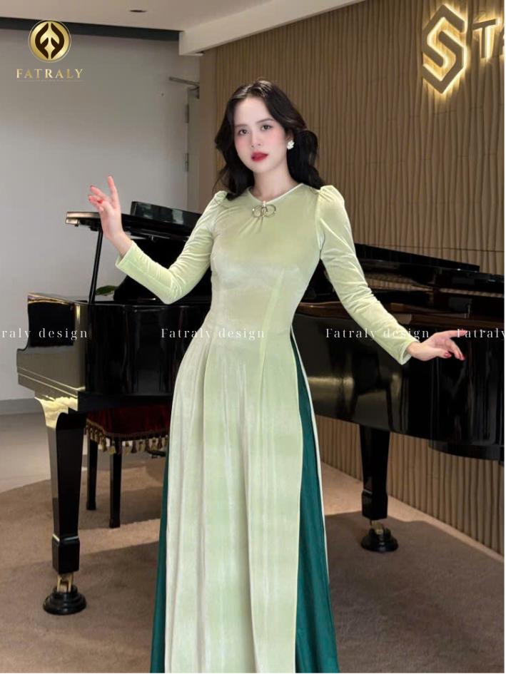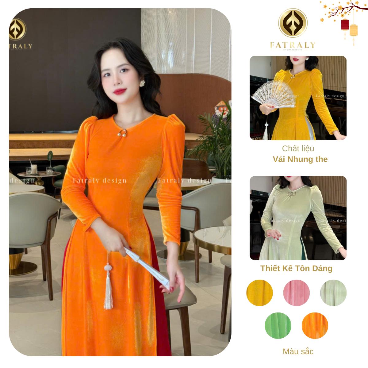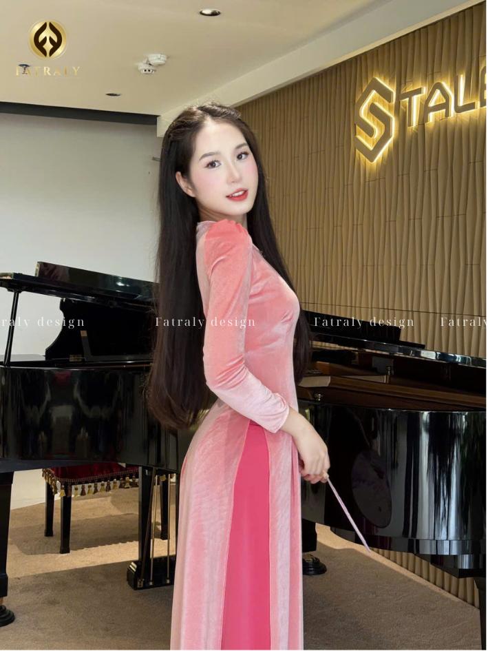 Fatraly – [ADTK 123] BST Áo Dài Nhung The Gam màu ngọt ngào tôn dáng. Chất liệu mềm mịn, co giãn nhẹ, che khuyết điểm bắp tay khéo léo. Áo dài này phù hợp cho dịp Tết, đi tiệc, chụp ảnh, nổi bật và sang trọng.