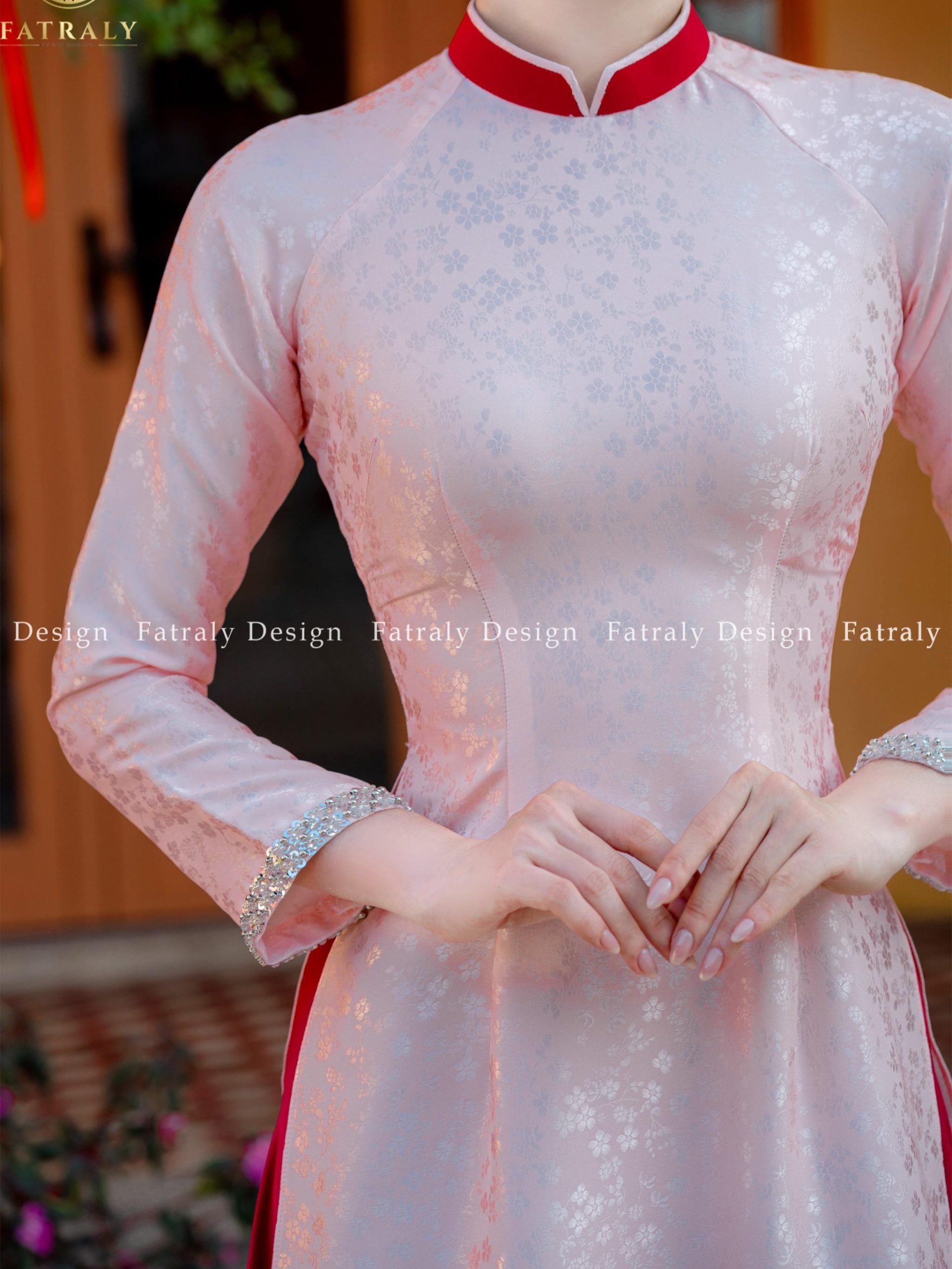 Áo dài nữ Fatraly thiết kế tinh tế hoa chân vải tơ tằm vân gấm hồng, chất liệu cao cấp, 3/4 tay, Maxi,