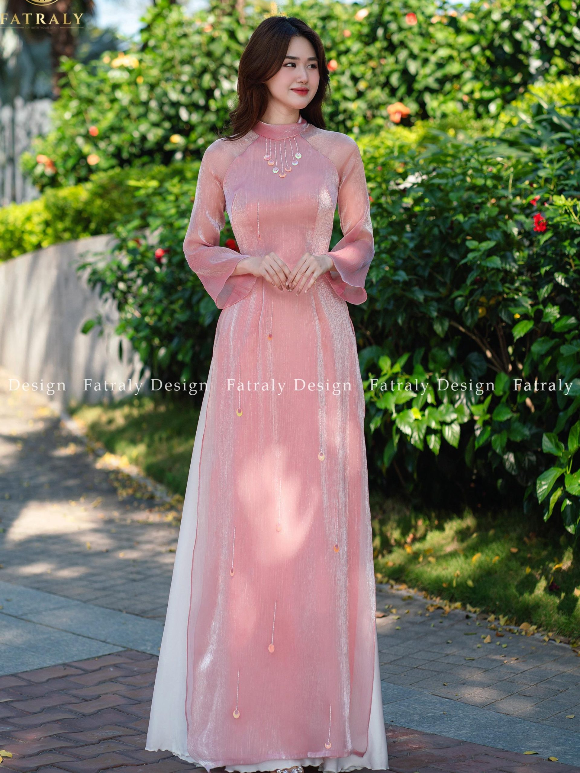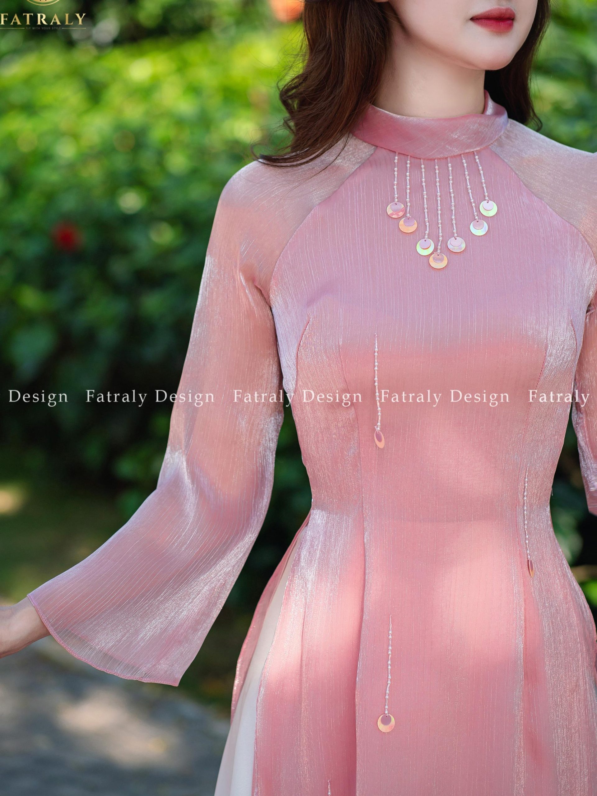 Áo dài nữ thiết kế 4 tà màu hồng vải tơ ánh lót lụa cao cấp, cổ áo đính kết thủ công