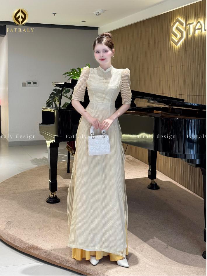 Áo dài vải lụa Vân Nhu thêu vân sọc dệt nhũ kim tuyến tay bồng, thiết kế 4 tà may thủ công cao cấp