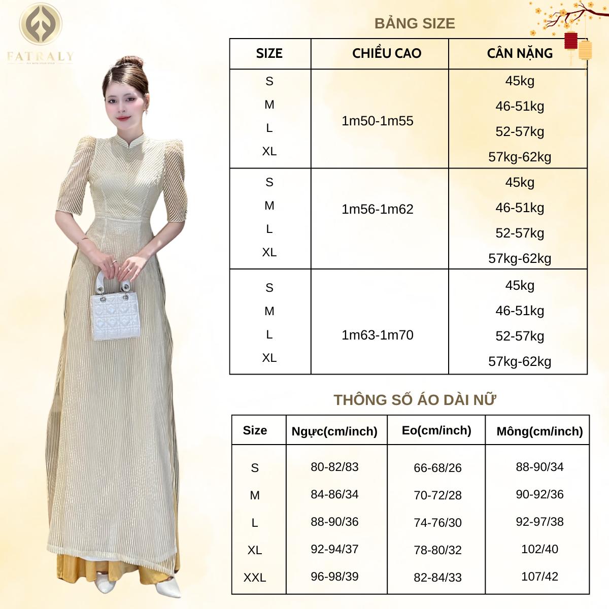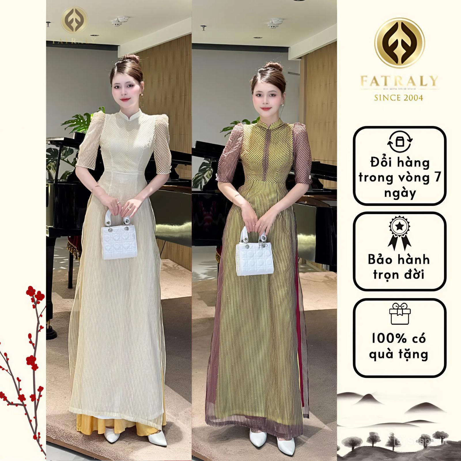 ADTK Vân Nhu – thêu vân sọc dệt nhũ kim tuyến (2 màu sọc tay bồng). Thiết kế 4 tà may thủ công cao cấp, vải tơ không co giãn. Áo dài nữ Fatraly mang đến sự kết hợp hoàn hảo giữa thiết kế truyền thống và hiện đại. Được làm từ vải lụa Vân Nhu cao cấp, đường chiết eo tinh tế kết hợp tay bồng giúp tôn dáng và che đi khuyết điểm.